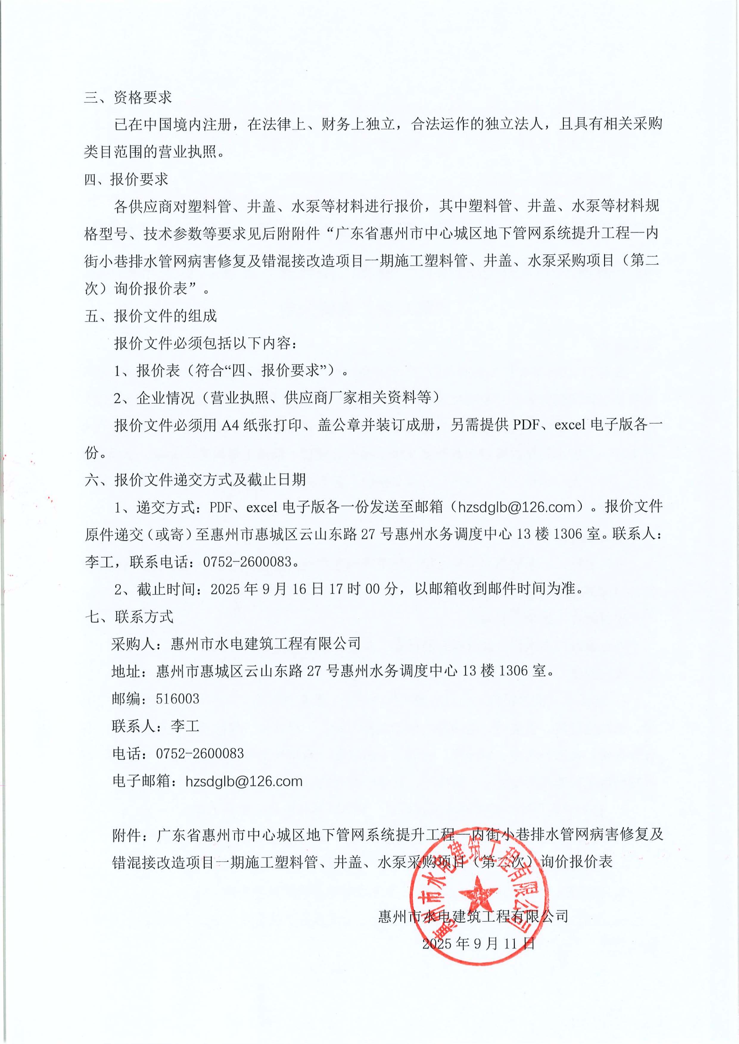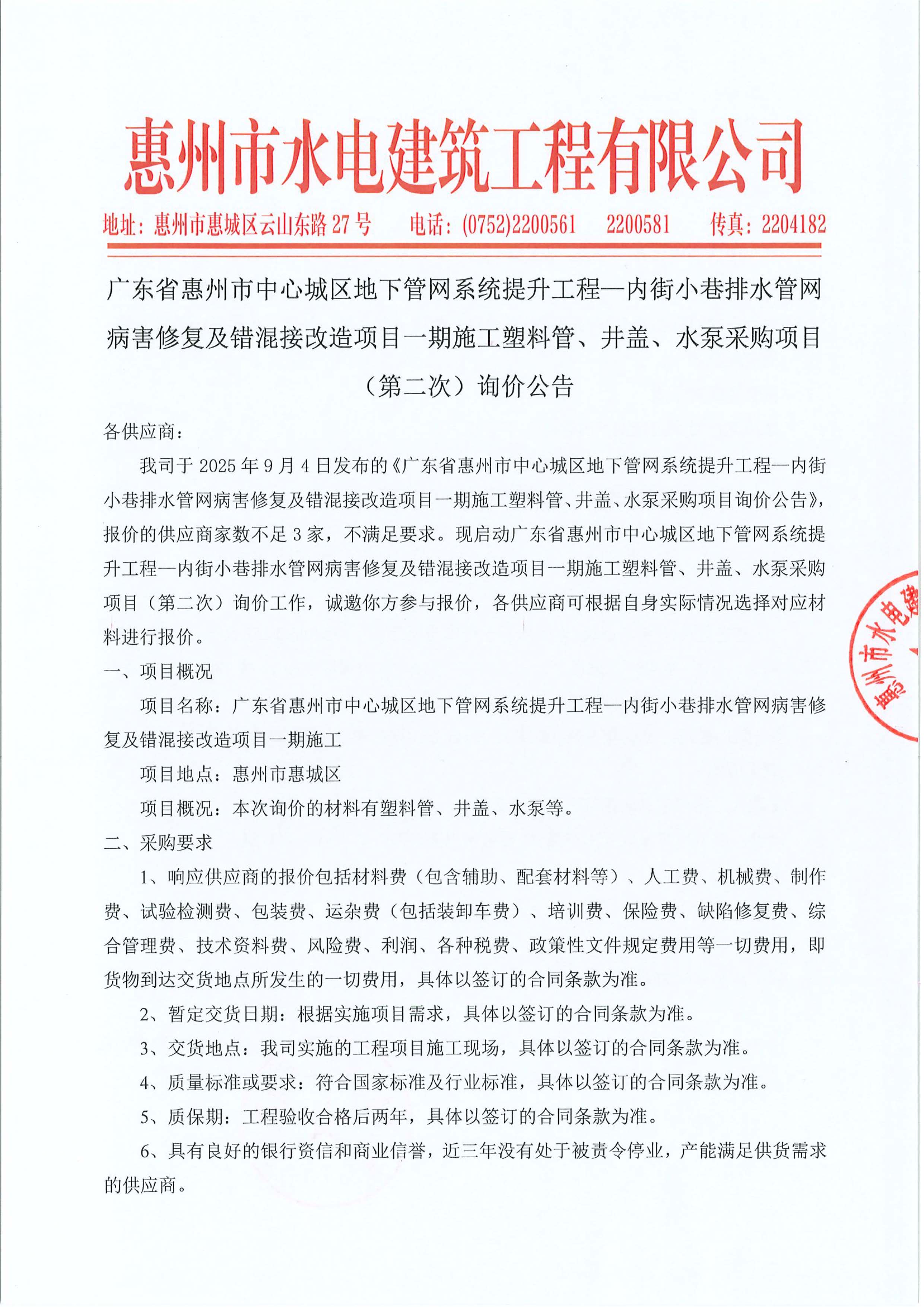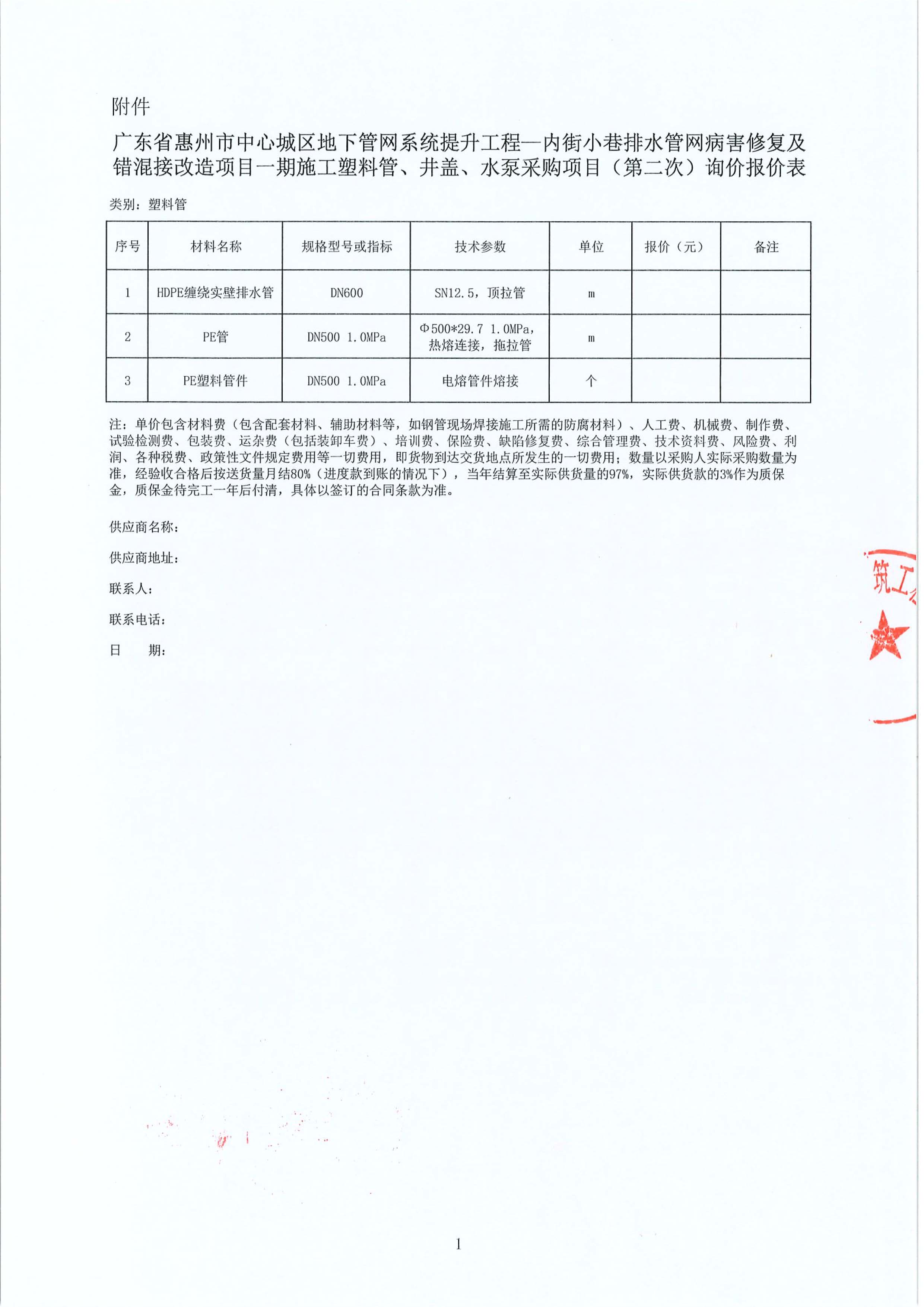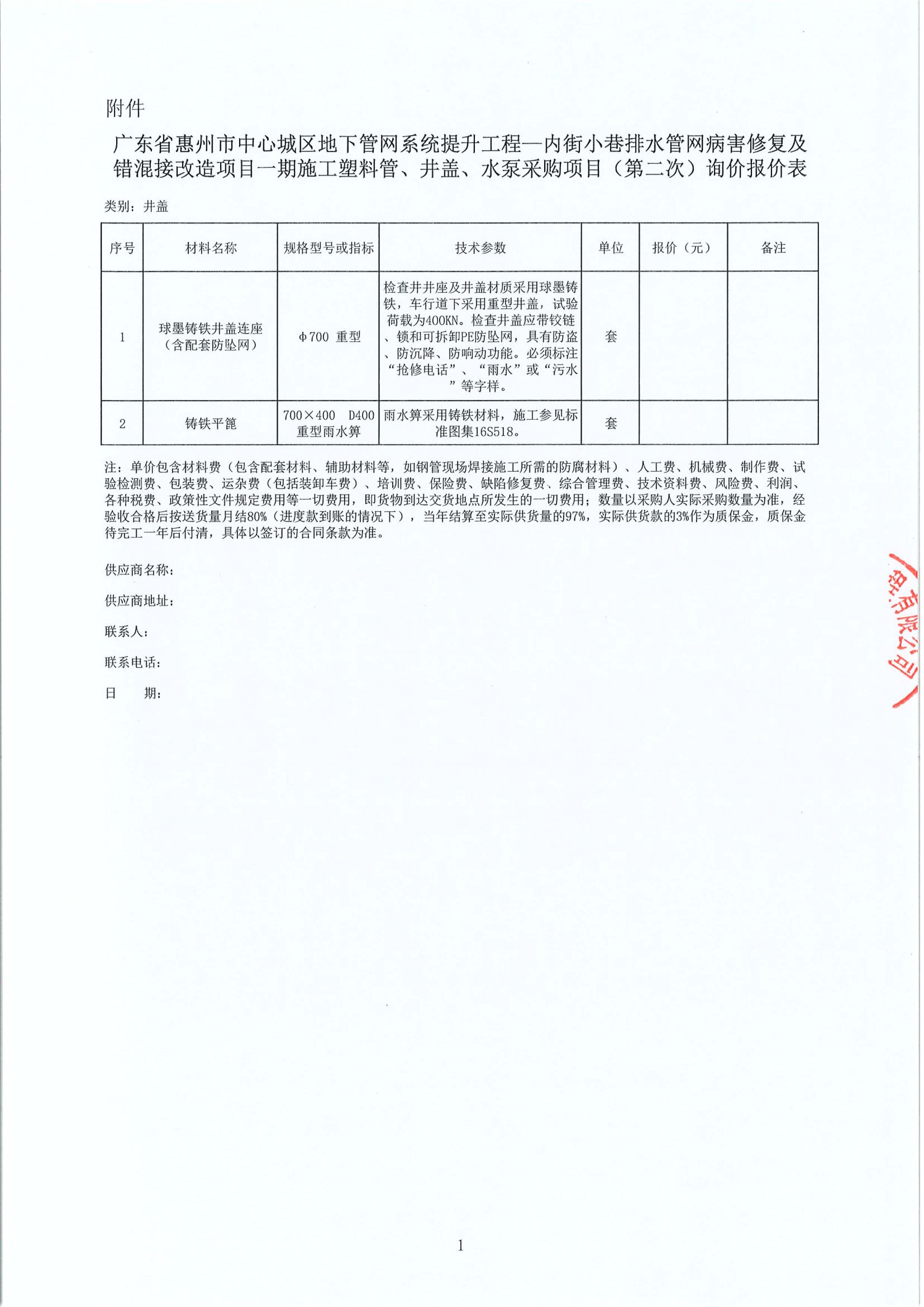 廣東省惠州市中心城區(qū)地下管網(wǎng)系統(tǒng)提升工程—內街小巷排水管網(wǎng)病害修復及錯混接改造項目一期施工塑料管、井蓋、水泵采購項目(第二次)詢價公告附件:
