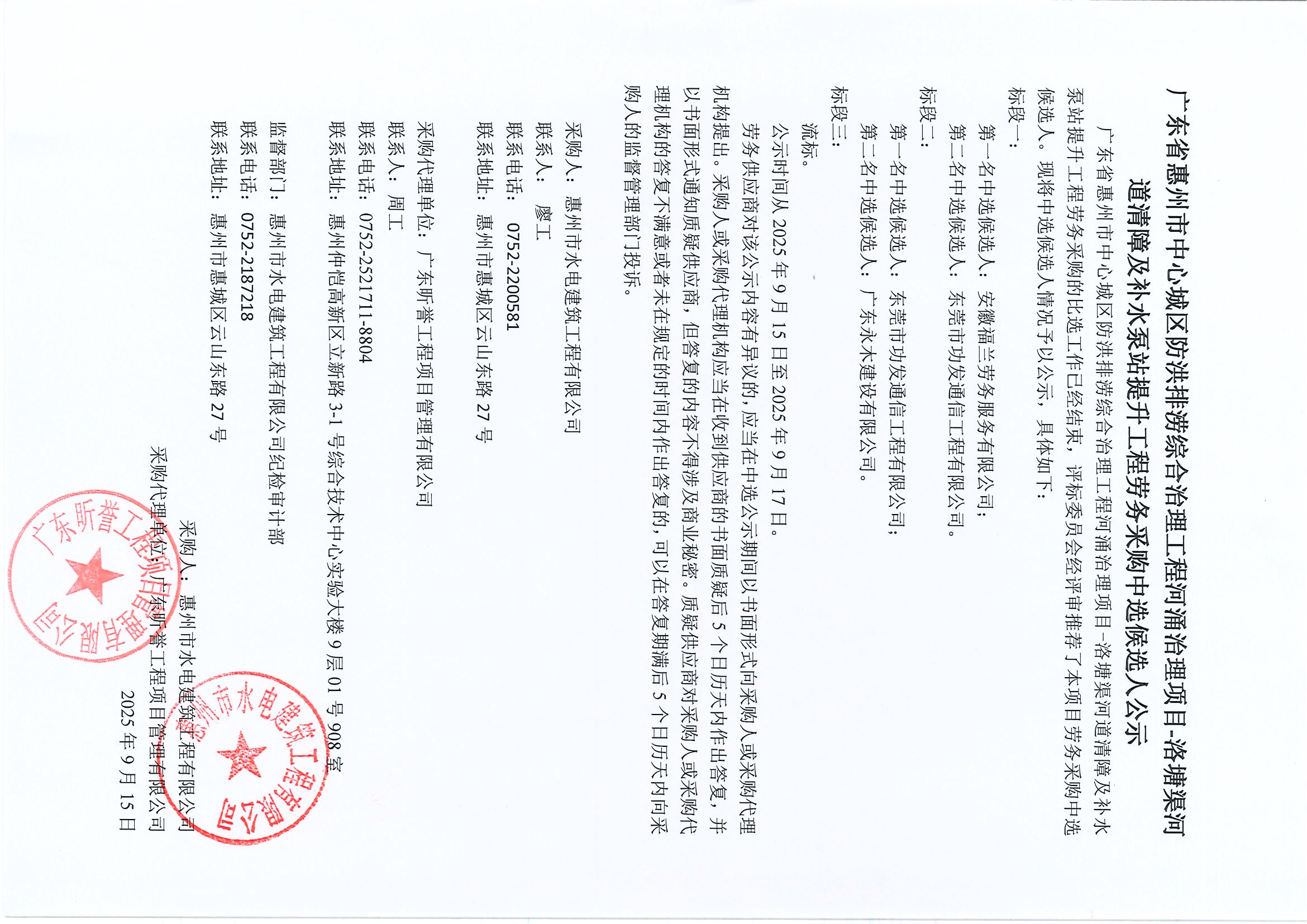 廣東省惠州市中心城區(qū)防洪排澇綜合治理工程河涌治理項目-洛塘渠河道清障及補水泵站提升工程勞務(wù)采購中選候選人公示