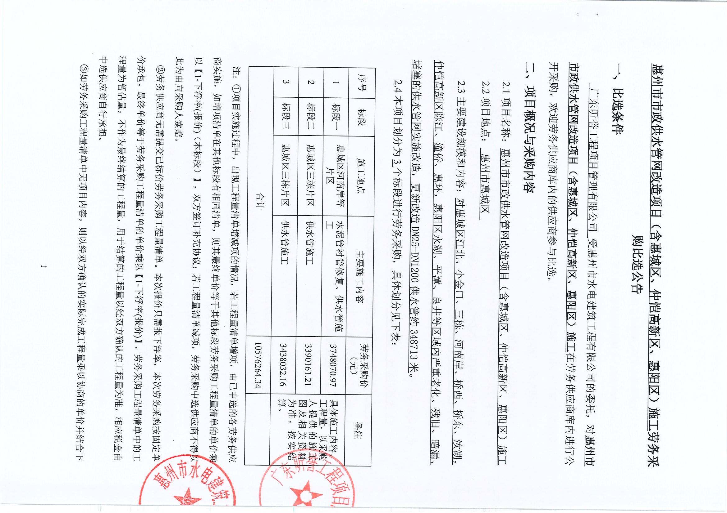 惠州市市政供水管網(wǎng)改造項目(含惠城區(qū)、仲愷高新區(qū)、惠陽區(qū))施工勞務采購比選公告