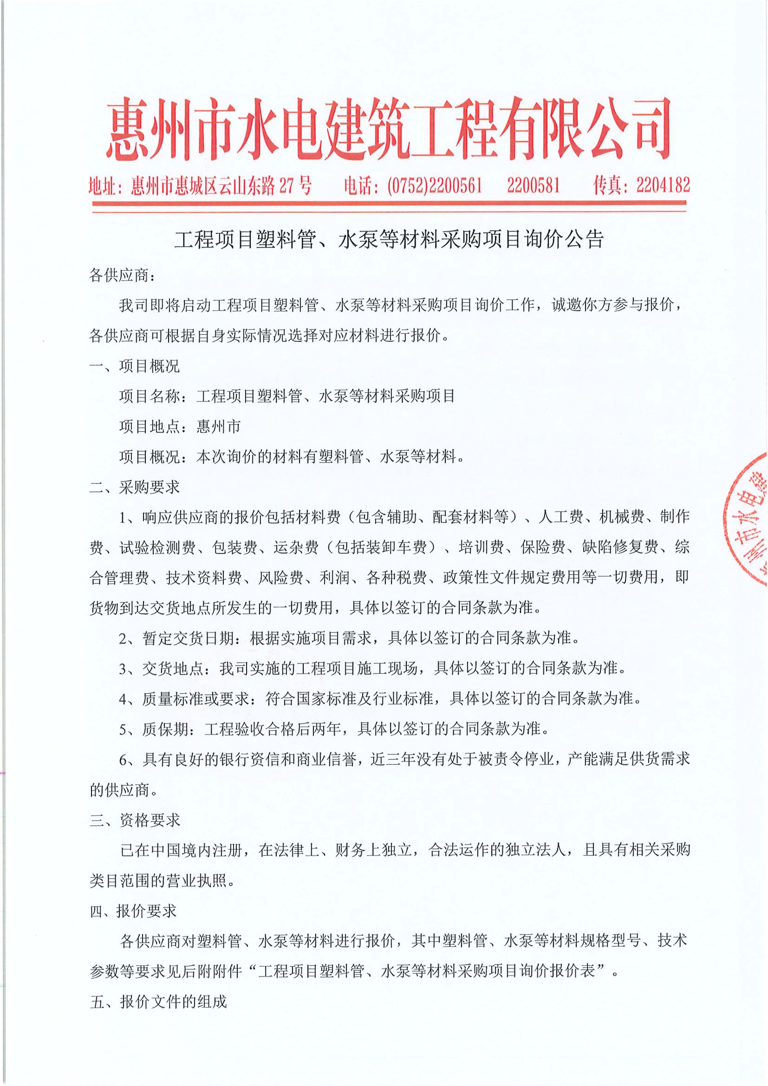 工程項目塑料管、水泵等材料采購項目詢價公告附件: