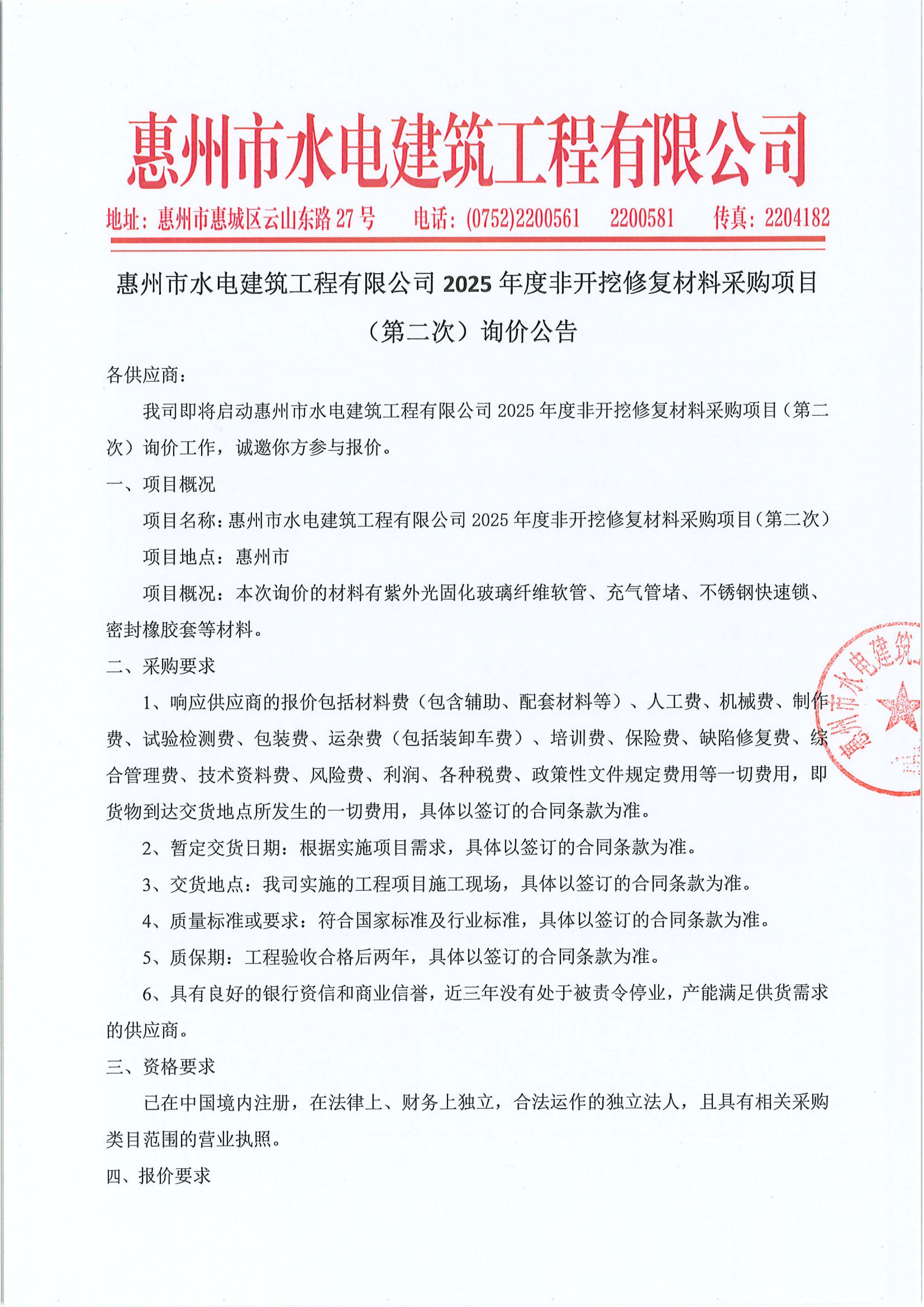 惠州市水電建筑工程有限公司2025年度非開挖修復(fù)材料采購項(xiàng)目(第二次)詢價(jià)公告