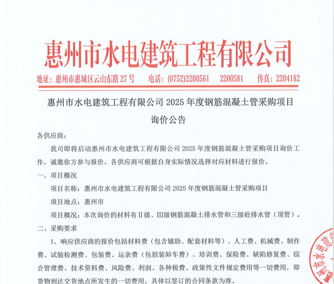 惠州市水電建筑工程有限公司2025年度鋼筋混凝土管采購項(xiàng)目詢價(jià)公告......