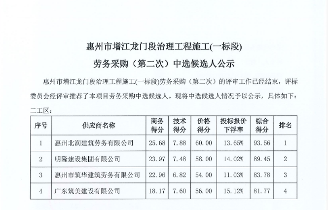 惠州市增江龍門段治理工程施工(一標(biāo)段)勞務(wù)采購(第二次)中選候選人公示......