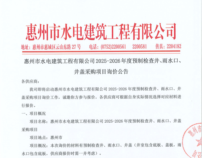 惠州市水電建筑工程有限公司2025-2026年度預(yù)制檢查井、雨水口、井蓋采購項(xiàng)目詢價(jià)公告......