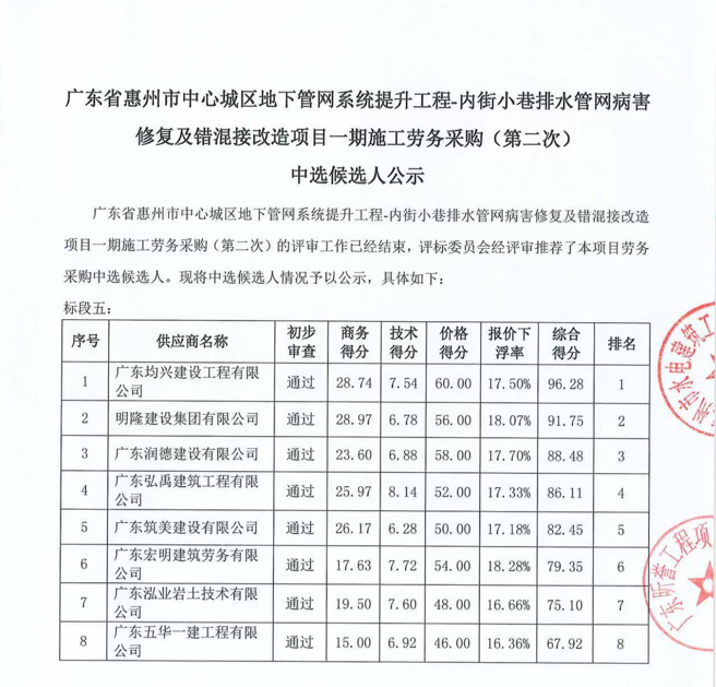 廣東省惠州市中心城區(qū)地下管網系統提升工程-內街小巷排水管網病害修復及錯混接改造項目一期施工勞務采購中選候選人公示......