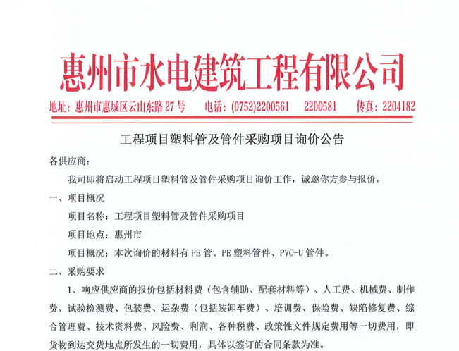 惠州市水電建筑工程有限公司2025年度非開挖修復(fù)材料采購(gòu)項(xiàng)目(第二次)詢價(jià)公告......
