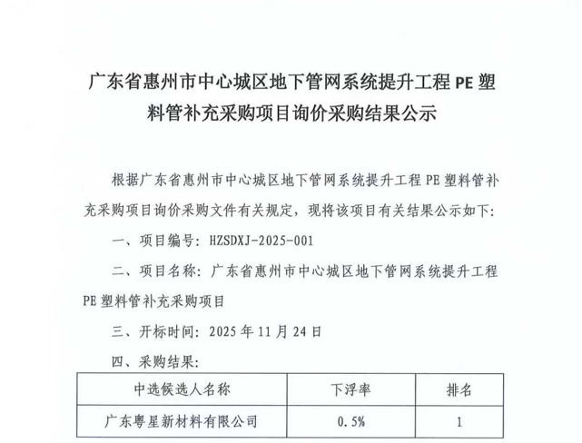 廣東省惠州市中心城區(qū)地下管網(wǎng)系統(tǒng)提升工程PE塑料管補(bǔ)充采購(gòu)項(xiàng)目詢價(jià)采購(gòu)結(jié)果公示......